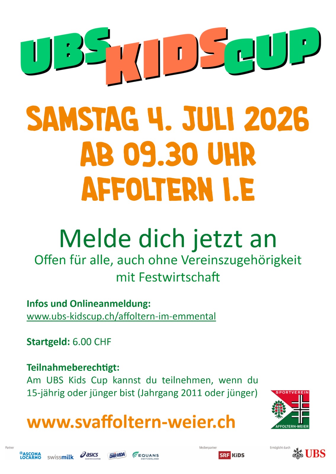 Der Sportverein Affoltern-Weier mit Ueli Kobel und Martin Zürcher führen zum 5. Mal in Folge eine lokale Ausscheidung zum UBS Kids Cup durch, für Kinder im Schulalter.